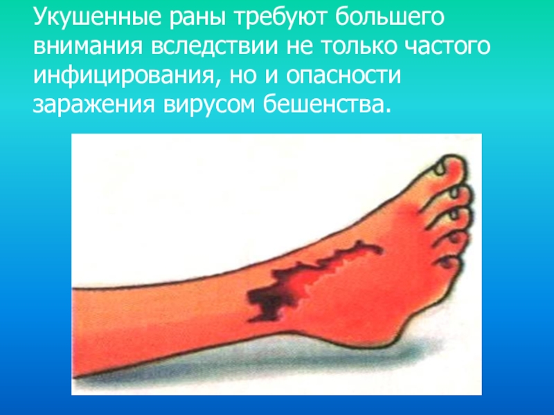 Слайд 5Укушенные раны требуют большего внимания вследствии не только частого инфицирования, но