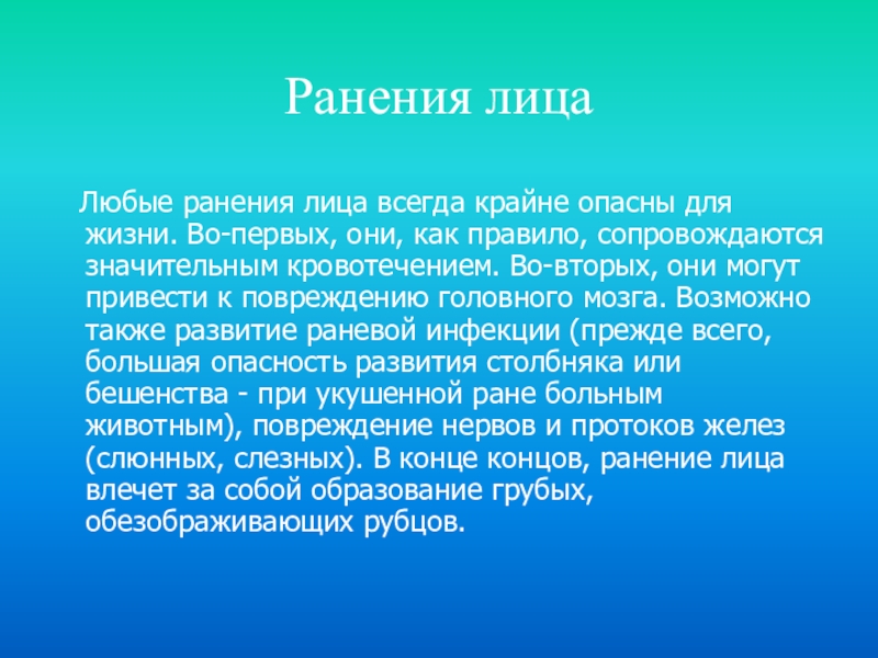 жизни. Во-первых, они, как правило, сопровождаются значительным кровотечением. Во-вторых, они могут привести к повреждению головного мозга. Возможно также развитие раневой инфекции (прежде всего, большая опасность развития столбняка или бешенства - при укушенной ране больным животным), повреждение нервов и протоков желез (слюнных, слезных). В конце концов, ранение лица влечет за собой образование грубых, обезображивающих рубцов.