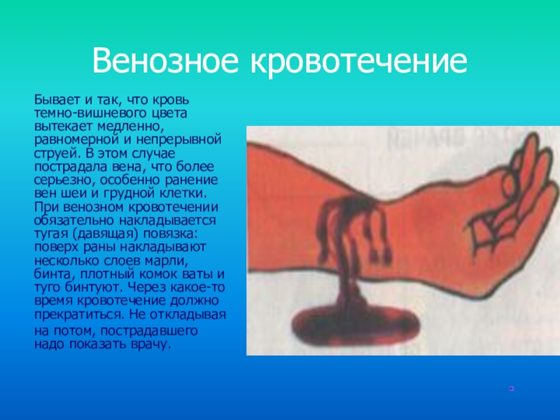 и непрерывной струей. В этом случае пострадала вена, что более серьезно, особенно ранение вен шеи и грудной клетки. При венозном кровотечении обязательно накладывается тугая (давящая) повязка: поверх раны накладывают несколько слоев марли, бинта, плотный комок ваты и туго бинтуют. Через какое-то время кровотечение должно прекратиться. Не откладывая