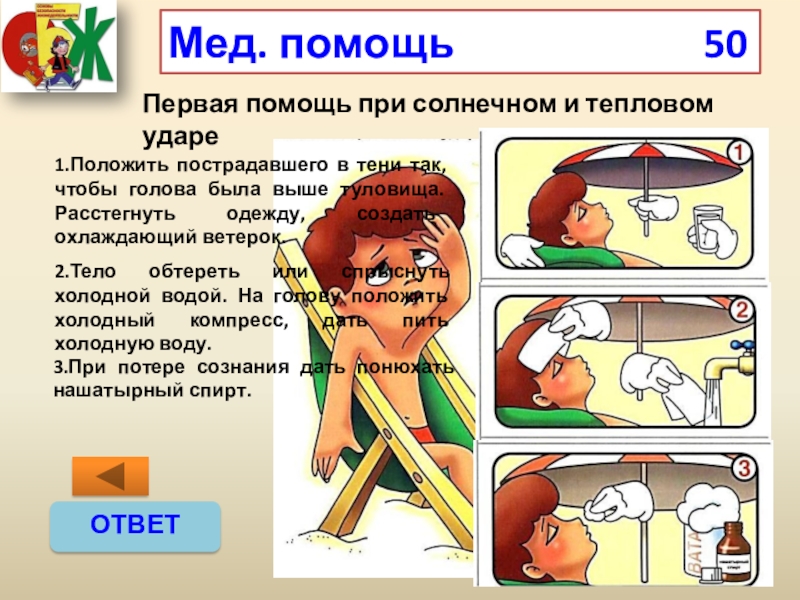 1.Положить пострадавшего в тени так, чтобы голова была выше туловища. Расстегнуть одежду, создать охлаждающий ветерок.