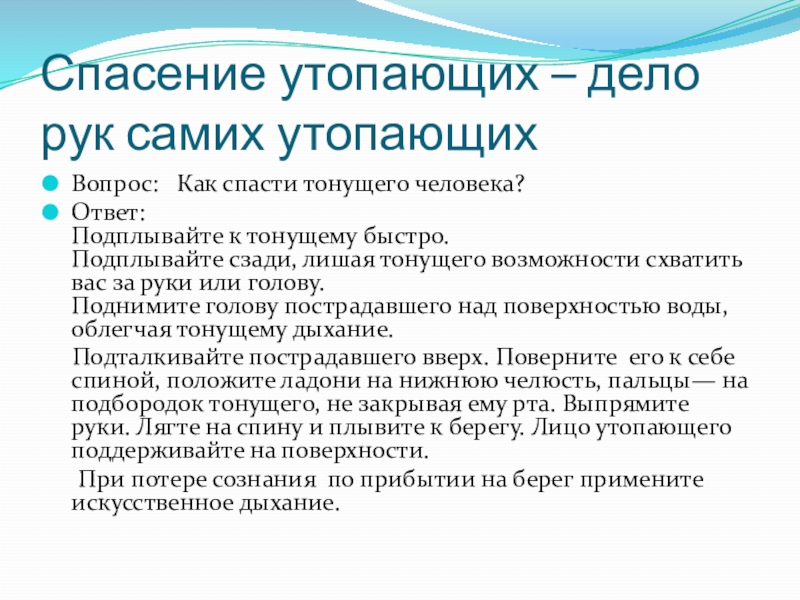 Спасение утопающих – дело рук самих утопающихВопрос:  Как спасти тонущего человека?Ответ: Подплывайте к тонущему быстро. Подплывайте