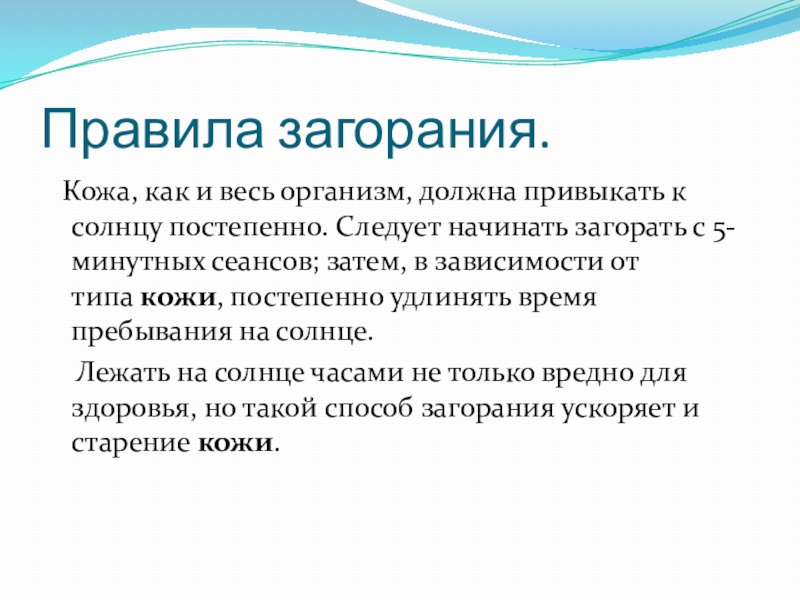 Правила загорания. Кожа, как и весь организм, должна привыкать к солнцу постепенно. Следует начинать загорать с 5-минутных
