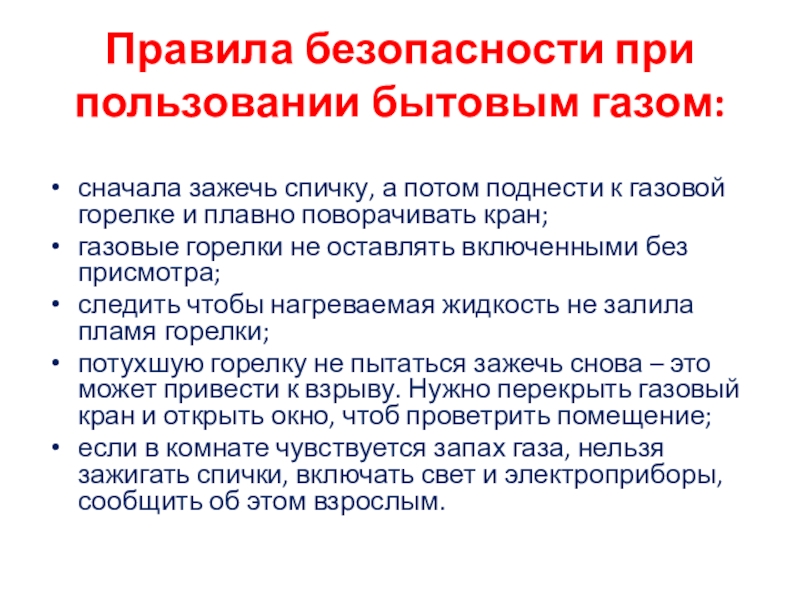 Слайд 7Правила безопасности при пользовании бытовым газом: