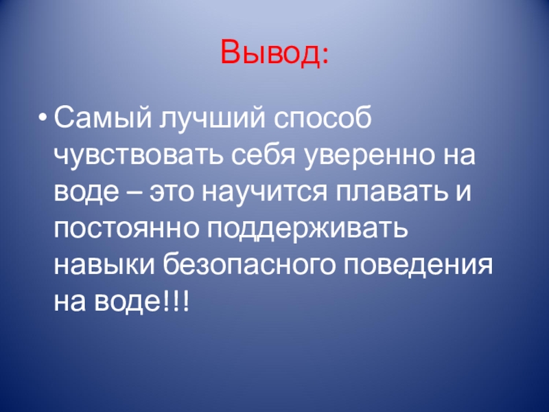 плавать и постоянно поддерживать навыки безопасного поведения на воде!!!