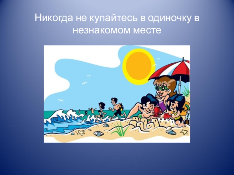 Слайд 6Никогда не купайтесь в одиночку в незнакомом месте