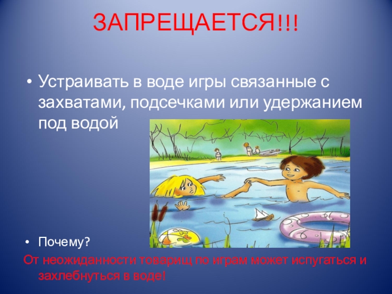 Устраивать в воде игры связанные с захватами, подсечками или удержанием под