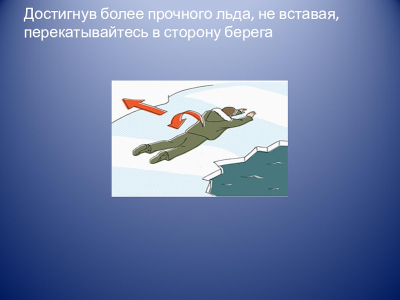 Слайд 34Достигнув более прочного льда, не вставая, перекатывайтесь в сторону берега