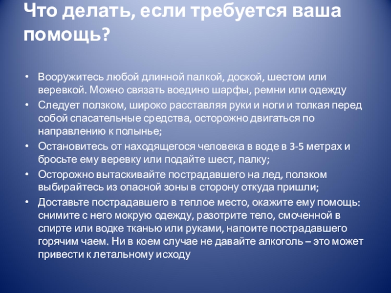 Осторожно вытаскивайте пострадавшего на лед, ползком выбирайтесь из опасной зоны в сторону откуда пришли;