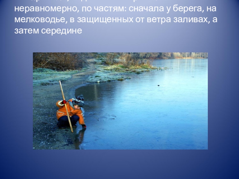 Слайд 17Как правило, водоемы замерзают неравномерно, по частям: сначала у берега, на