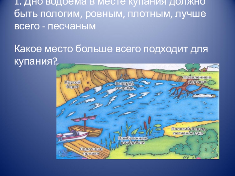 Слайд 31. Дно водоема в месте купания должно быть пологим, ровным, плотным,