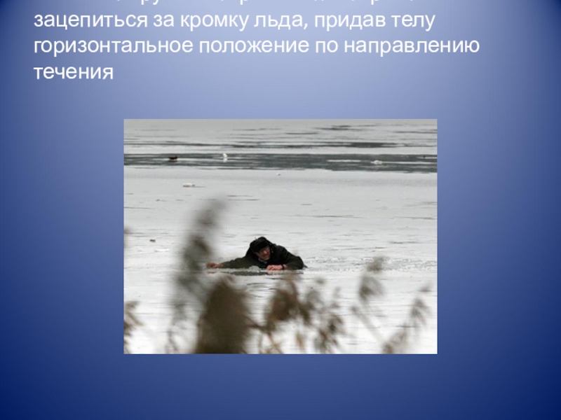 Слайд 31Раскиньте руки в стороны и постарайтесь зацепиться за кромку льда, придав