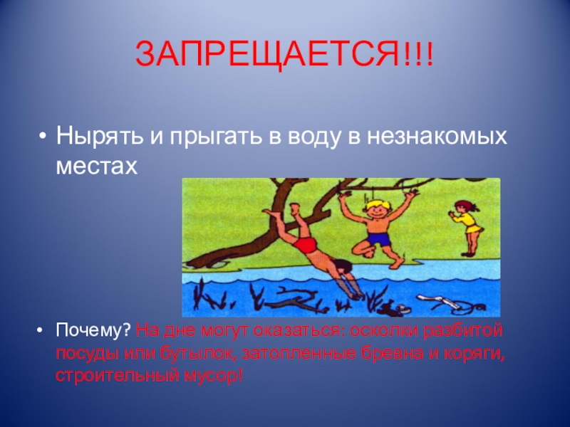 оказаться: осколки разбитой посуды или бутылок, затопленные бревна и коряги, строительный мусор!