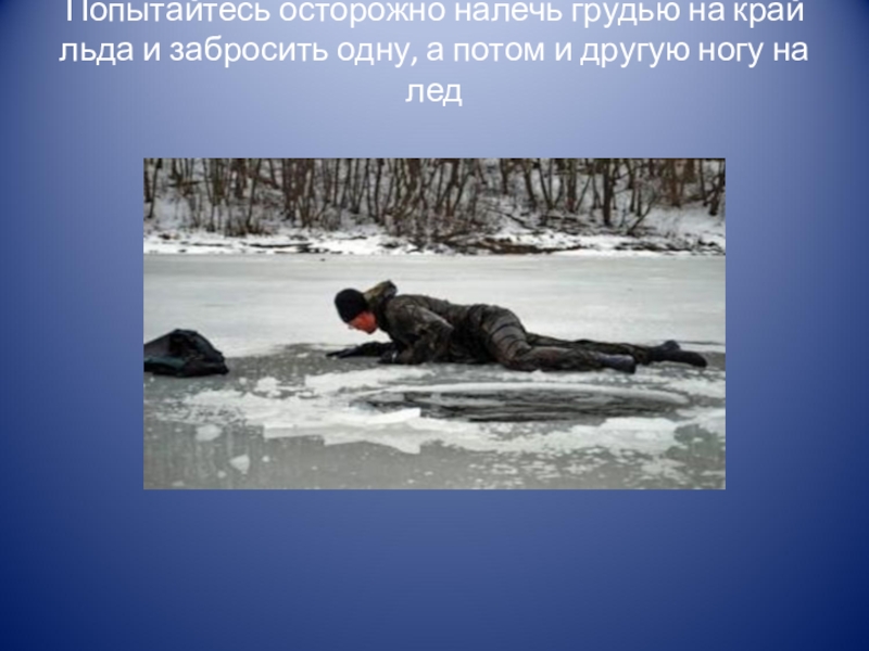 Слайд 32Попытайтесь осторожно налечь грудью на край льда и забросить одну, а