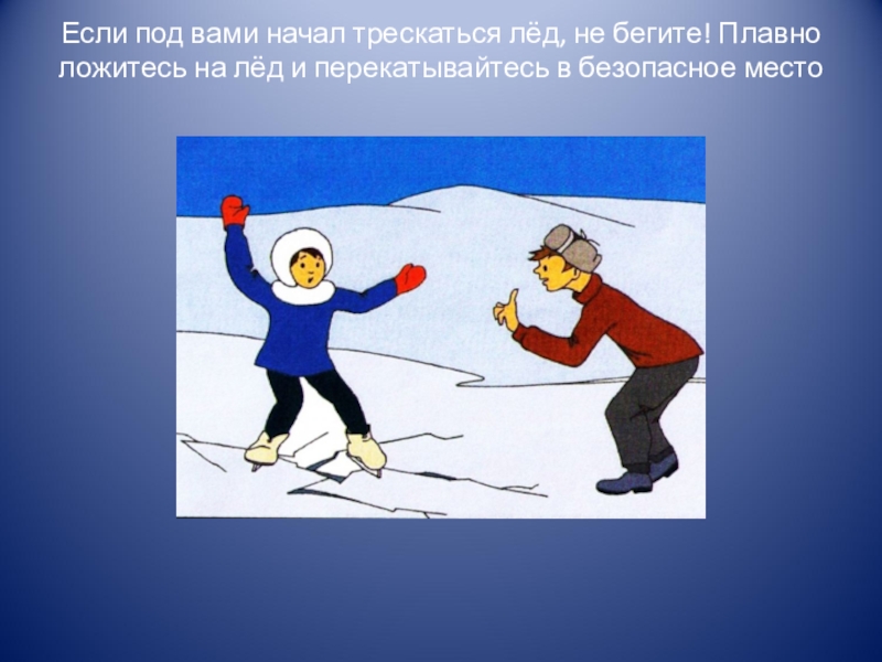 Слайд 29Если под вами начал трескаться лёд, не бегите! Плавно ложитесь на