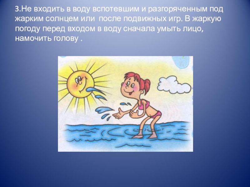 после подвижных игр. В жаркую погоду перед входом в воду сначала умыть лицо, намочить голову .