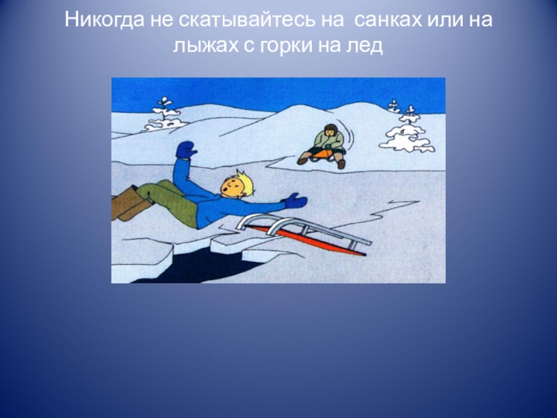 Слайд 28Никогда не скатывайтесь на санках или на лыжах с горки на