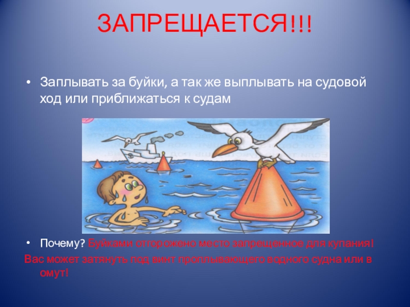 Вас может затянуть под винт проплывающего водного судна или в омут!
