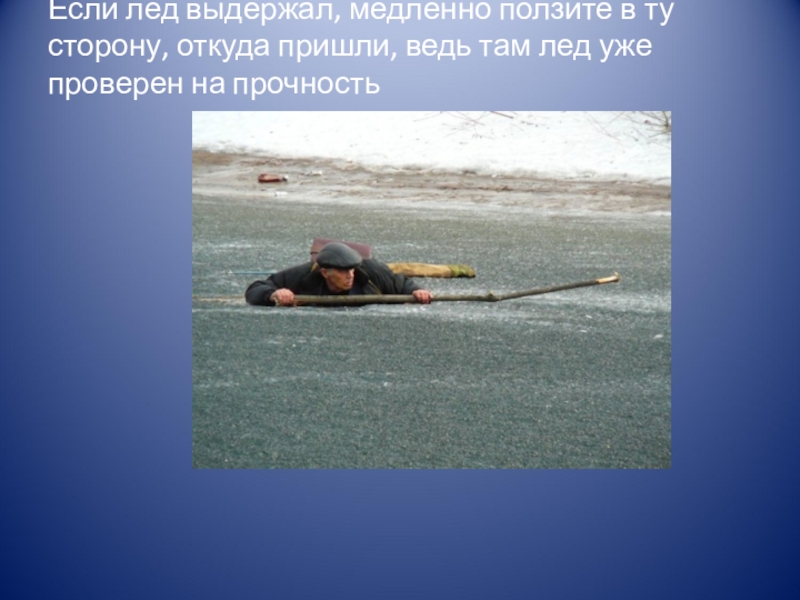 Слайд 33Если лед выдержал, медленно ползите в ту сторону, откуда пришли, ведь