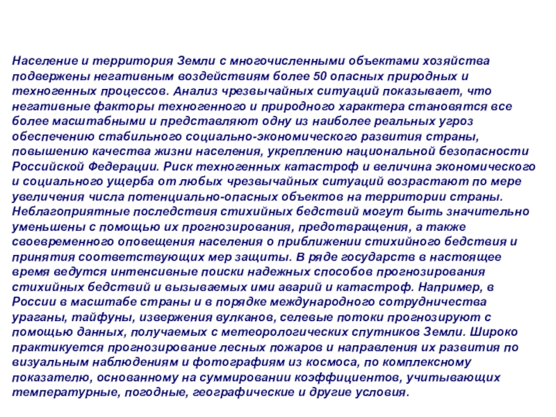 более 50 опасных природных и техногенных процессов. Анализ чрезвычайных ситуаций показывает, что негативные факторы техногенного и природного характера становятся все более масштабными и представляют одну из наиболее реальных угроз обеспечению стабильного социально-экономического развития страны, повышению качества жизни населения, укреплению национальной безопасности Российской Федерации. Риск техногенных катастроф и величина экономического и социального ущерба от любых чрезвычайных ситуаций возрастают по мере увеличения числа потенциально-опасных объектов на территории страны.Неблагоприятные последствия стихийных бедствий могут быть значительно уменьшены с помощью их прогнозирования, предотвращения, а также своевременного оповещения населения о приближении стихийного бедствия и принятия соответствующих мер защиты. В ряде государств в настоящее время ведутся интенсивные поиски надежных способов прогнозирования стихийных бедствий и вызываемых ими аварий и катастроф. Например, в России в масштабе страны и в порядке международного сотрудничества ураганы, тайфуны, извержения вулканов, селевые потоки прогнозируют с помощью данных, получаемых с метеорологических спутников Земли. Широко практикуется прогнозирование лесных пожаров и направления их развития по визуальным наблюдениям и фотографиям из космоса, по комплексному показателю, основанному на суммировании коэффициентов, учитывающих температурные, погодные, географические и другие условия.