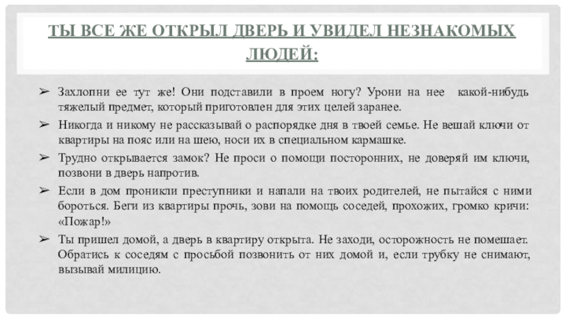 -незнакомцы решаются ломать дверь? Звони в милицию («02») или в службу спасения («112»), родителям, а если нет телефона или он не работает, выйди на балкон или открой окно и громко кричи: «Пожар!»;
