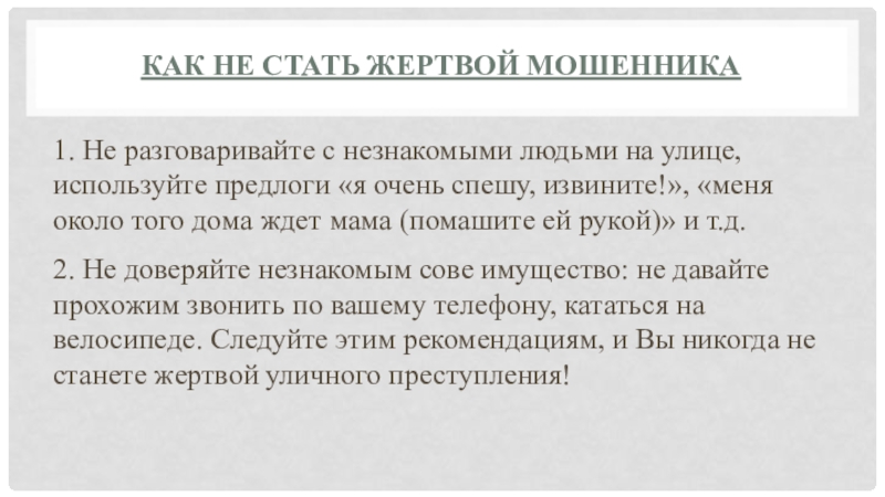 2. Не доверяйте незнакомым сове имущество: не давайте прохожим звонить по вашему телефону, кататься на велосипеде. Следуйте этим рекомендациям, и Вы никогда не станете жертвой уличного преступления!