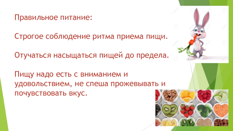 Слайд 5Правильное питание: Строгое соблюдение ритма приема пищи. Отучаться насыщаться пищей до предела. Пищу надо