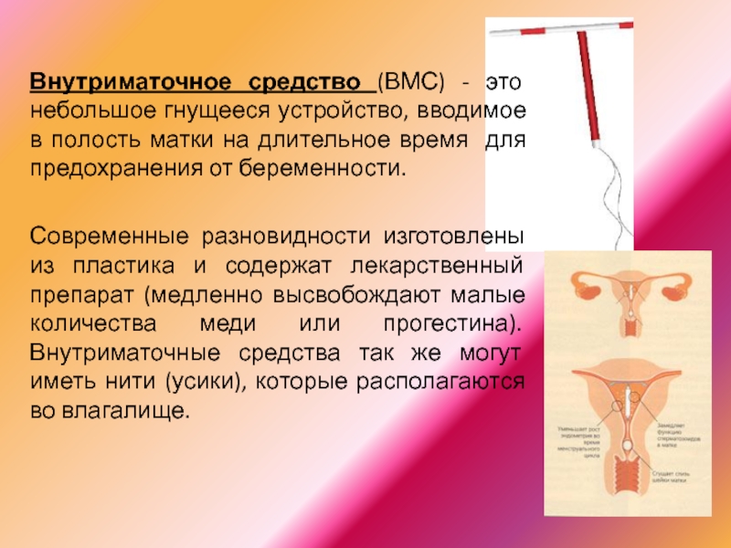 Слайд 17Внутриматочное средство (ВМС) - это небольшое гнущееся устройство, вводимое в полость