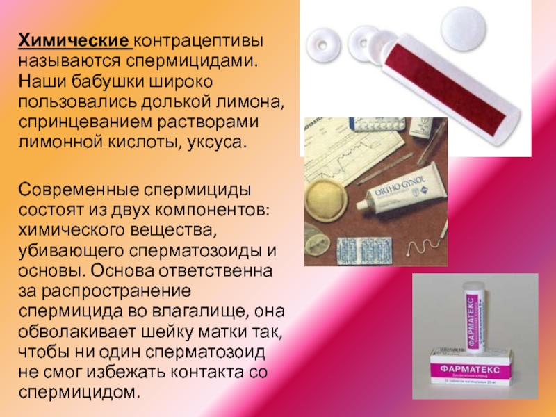 Химические контрацептивы называются спермицидами. Наши бабушки широко пользовались долькой лимона, спринцеванием