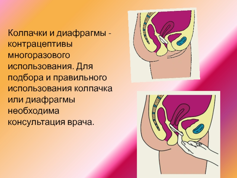Слайд 16Колпачки и диафрагмы - контрацептивы многоразового использования. Для подбора и правильного