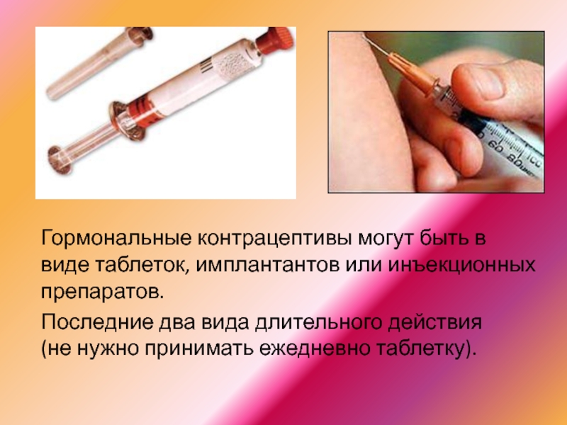 Слайд 11Гормональные контрацептивы могут быть в виде таблеток, имплантантов или инъекционных препаратов.