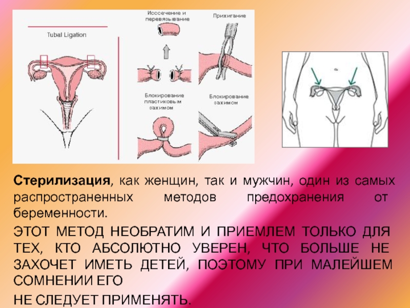 Слайд 20Стерилизация, как женщин, так и мужчин, один из самых распространенных методов