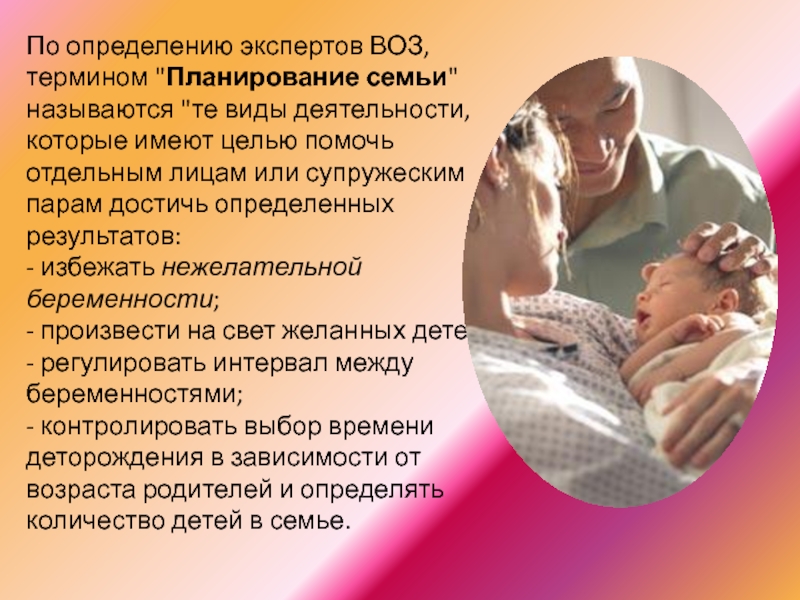 Слайд 5По определению экспертов ВОЗ, термином "Планирование семьи" называются "те виды деятельности,