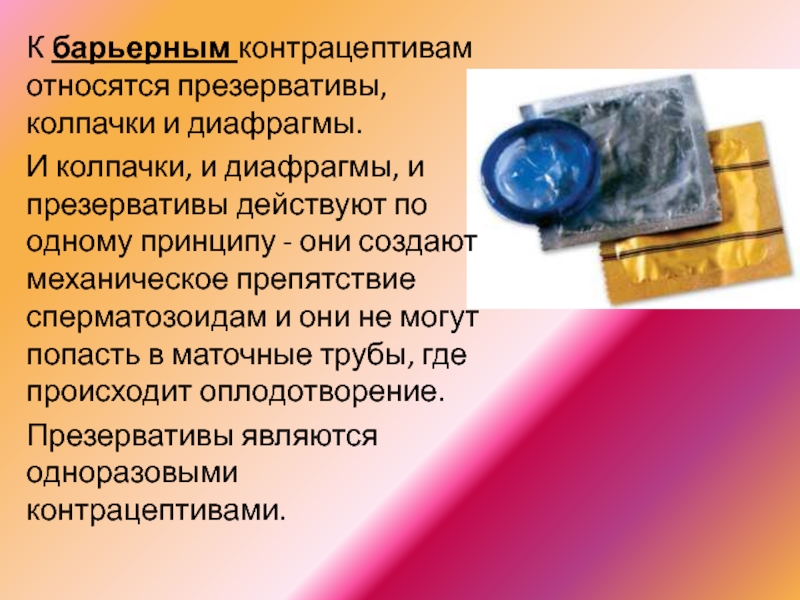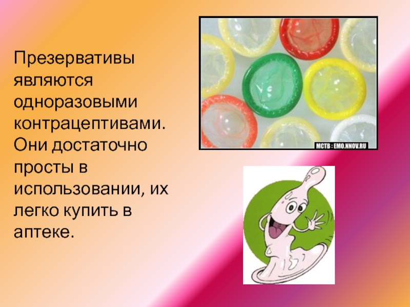 Слайд 15Презервативы являются одноразовыми контрацептивами. Они достаточно просты в использовании, их легко