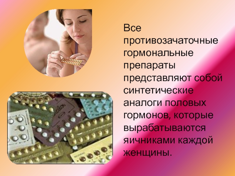 Слайд 12Все противозачаточные гормональные препараты представляют собой синтетические аналоги половых гормонов, которые