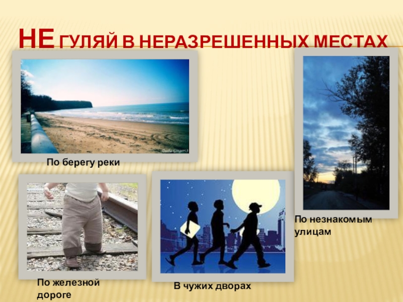 Не гуляй в неразрешенных местахПо железной дорогеПо незнакомым улицамВ чужих дворахПо берегу реки