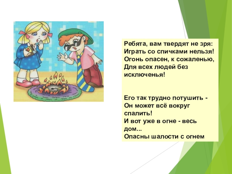 Слайд 5Ребята, вам твердят не зря: Играть со спичками нельзя! Огонь опасен,