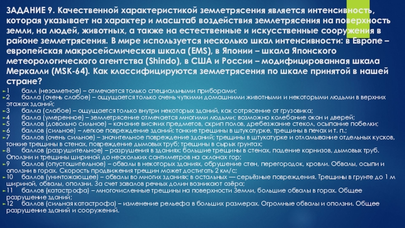 и масштаб воздействия землетрясения на поверхность земли, на людей, животных, а также на естественные и искусственные сооружения в районе землетрясения. В мире используется несколько шкал интенсивности: в Европе – европейская макросейсмическая шкала (EMS), в Японии – шкала Японского метеорологического агентства (Shindo), в США и России – модифицированная шкала Меркалли (MSK-64). Как классифицируются землетрясения по шкале принятой в нашей стране?