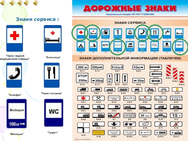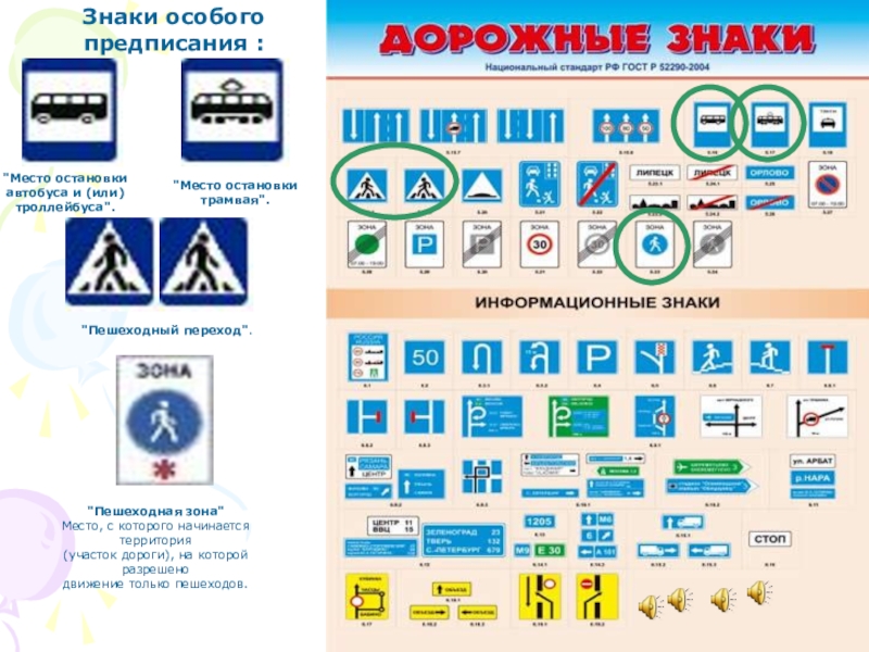 Указывают место нахождения пешеходного перехода, остановки автобуса и т.д.