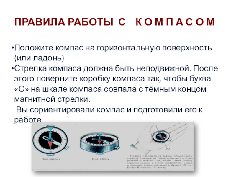 Стрелка компаса должна быть неподвижной. После этого поверните коробку компаса так, чтобы буква «С» на шкале компаса совпала с тёмным концом магнитной стрелки.