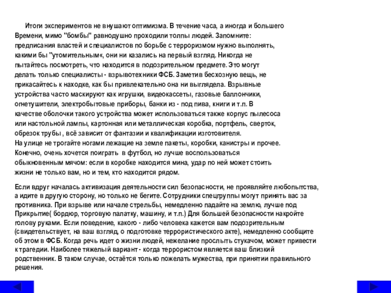 или бесхозных вещах следует сообщать машинисту .К сожалению, далеко не все реагируют на эти призывы и поступают в соответствии с принципами личной и общественной безопасности. Журналисты и специалисты