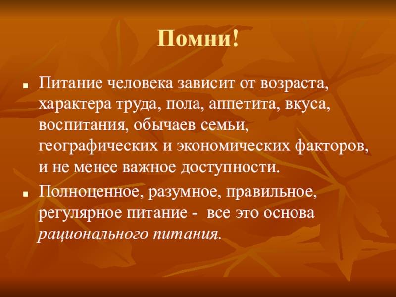 Питание человека зависит от возраста, характера труда, пола, аппетита, вкуса, воспитания,