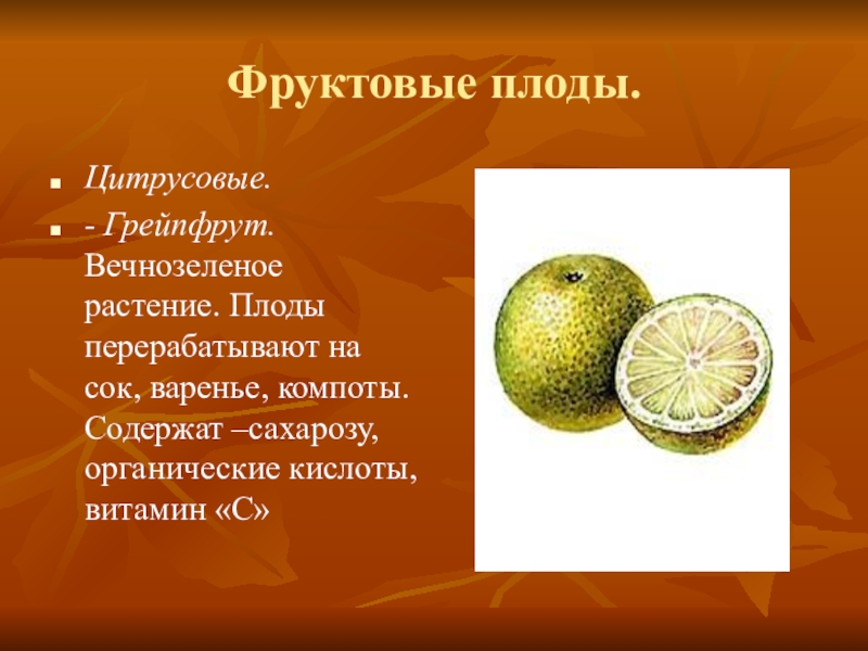 - Грейпфрут. Вечнозеленое растение. Плоды перерабатывают на сок, варенье, компоты.