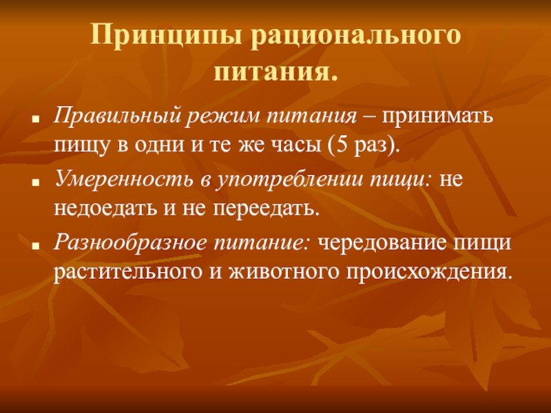 Разнообразное питание: чередование пищи растительного и животного происхождения.