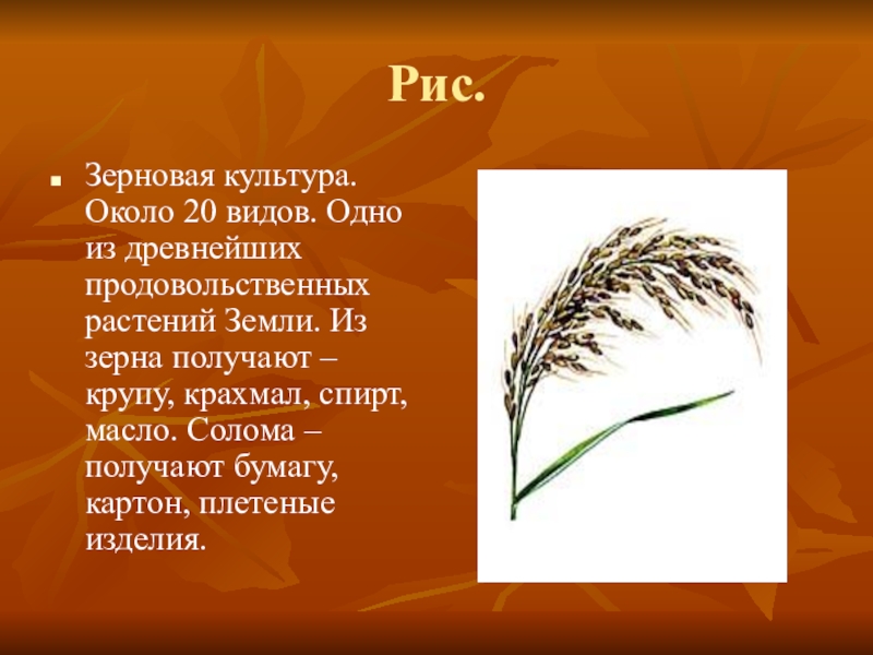 Из зерна получают – крупу, крахмал, спирт, масло. Солома – получают бумагу, картон, плетеные изделия.