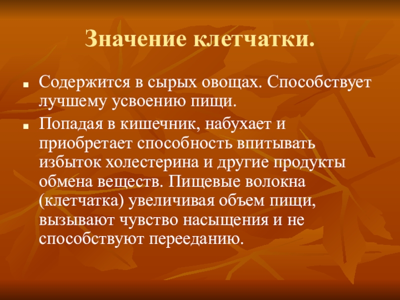 набухает и приобретает способность впитывать избыток холестерина и другие продукты обмена веществ. Пищевые волокна (клетчатка) увеличивая объем пищи, вызывают чувство насыщения и не способствуют перееданию.