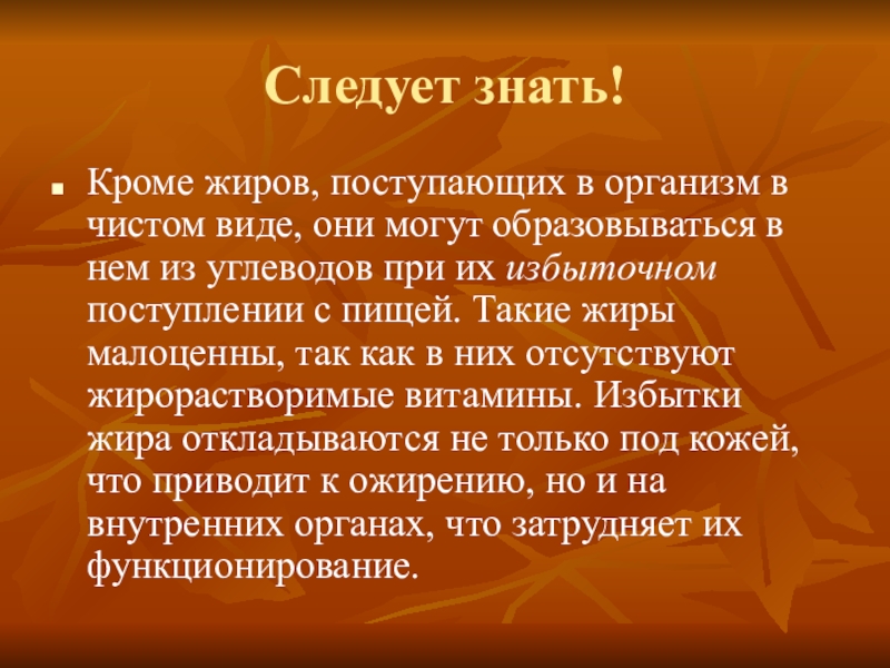 образовываться в нем из углеводов при их избыточном поступлении с пищей. Такие жиры малоценны, так как в них отсутствуют жирорастворимые витамины. Избытки жира откладываются не только под кожей, что приводит к ожирению, но и на внутренних органах, что затрудняет их функционирование.