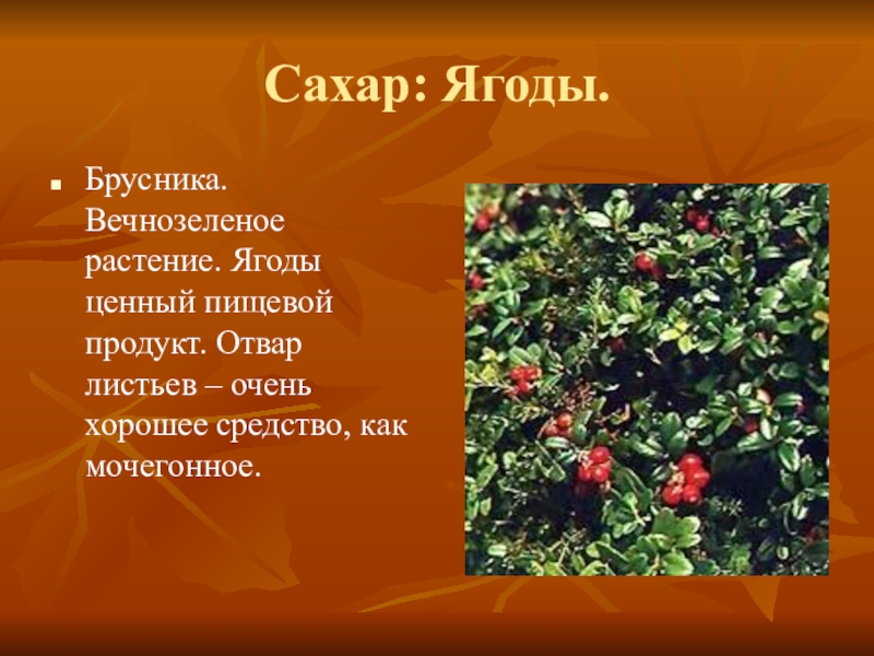 Брусника. Вечнозеленое растение. Ягоды ценный пищевой продукт. Отвар листьев –