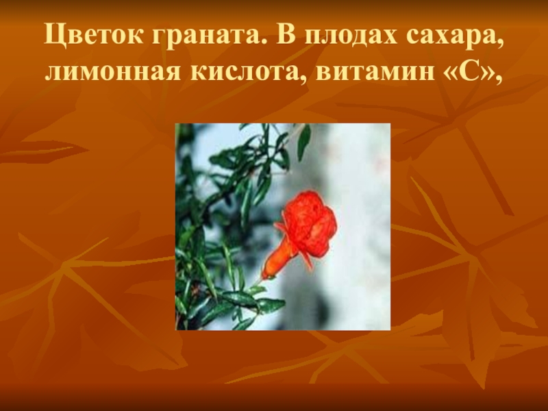 Слайд 32Цветок граната. В плодах сахара, лимонная кислота, витамин «С»,