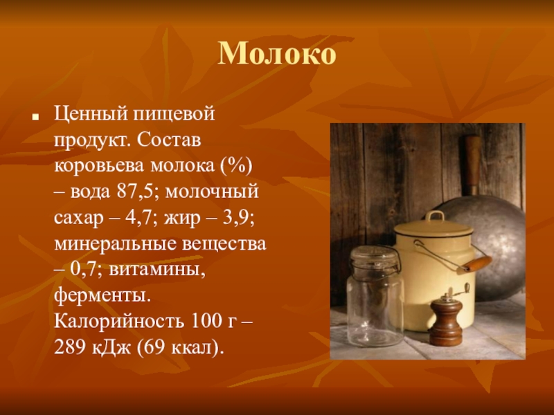 Ценный пищевой продукт. Состав коровьева молока (%) – вода 87,5; молочный