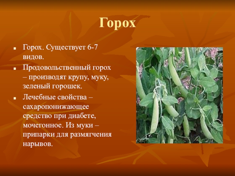 Продовольственный горох – производят крупу, муку, зеленый горошек.